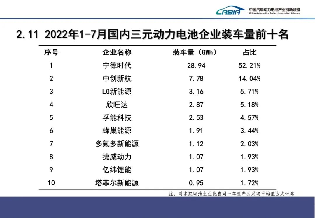 產(chǎn)量方面:7月,我國(guó)動(dòng)力電池產(chǎn)量共計(jì)47.2GWh,同比增長(zhǎng)172.2%,環(huán)比增長(zhǎng)14.4%。其中三元電池產(chǎn)量16.6GWh,占總產(chǎn)量35.1%,同比增長(zhǎng)107.7%,環(huán)比下降9.4%;磷酸鐵鋰電池產(chǎn)量30.6GWh,占總產(chǎn)量64.8%,同比增長(zhǎng)228%,環(huán)比增長(zhǎng)33.5%。1-7月,我國(guó)動(dòng)力電池累計(jì)產(chǎn)量253.7GWh,累計(jì)同比增長(zhǎng)175.6%。其中三元電池累計(jì)產(chǎn)量99.5GWh,占總產(chǎn)量39.2%,累計(jì)同比增長(zhǎng)121.9%;磷酸鐵鋰電池累計(jì)產(chǎn)量153.8GWh,占總產(chǎn)量60.6%,累計(jì)同比增長(zhǎng)227.1%。裝車(chē)量方面:7月,我國(guó)動(dòng)力電池裝車(chē)量24.2GWh,同比增長(zhǎng)114.2%,環(huán)比下降10.5%。其中三元電池裝車(chē)量9.8GWh,占總裝車(chē)量40.7%,同比增長(zhǎng)80.4%,環(huán)比下降15.0%;磷酸鐵鋰電池裝車(chē)量14.3GWh,占總裝車(chē)量59.3%,同比增長(zhǎng)147.2%,環(huán)比下降7.0%。1-7月,我國(guó)動(dòng)力電池累計(jì)裝車(chē)量134.3GWh, 累計(jì)同比增長(zhǎng)110.6%。其中三元電池累計(jì)裝車(chē)量55.4GWh,占總裝車(chē)量41.3%,累計(jì)同比增長(zhǎng)55.7%;磷酸鐵鋰電池累計(jì)裝車(chē)量78.7GWh,占總裝車(chē)量58.6%,累計(jì)同比增長(zhǎng)180.9%,呈現(xiàn)快速增長(zhǎng)發(fā)展勢(shì)頭 7月,我國(guó)新能源汽車(chē)市場(chǎng)共計(jì)37家動(dòng)力電池企業(yè)實(shí)現(xiàn)裝車(chē)配套,較去年同期減少8家。排名前3家、前5家、前10家動(dòng)力電池企業(yè)動(dòng)力電池裝車(chē)量分別為19.0GWh、20.9GWh和23.2GWh,占總裝車(chē)量比分別為78.5%、86.3%和95.9%。1-7月,我國(guó)新能源汽車(chē)市場(chǎng)共計(jì)45家動(dòng)力電池企業(yè)實(shí)現(xiàn)裝車(chē)配套,較去年同期減少8家,排名前3家、前5家、前10家動(dòng)力電池企業(yè)動(dòng)力電池裝車(chē)量分別為103.6GWh、113.5GWh和127.3GWh,占總裝車(chē)量比分別為77.1%、84.5%和94.8%。